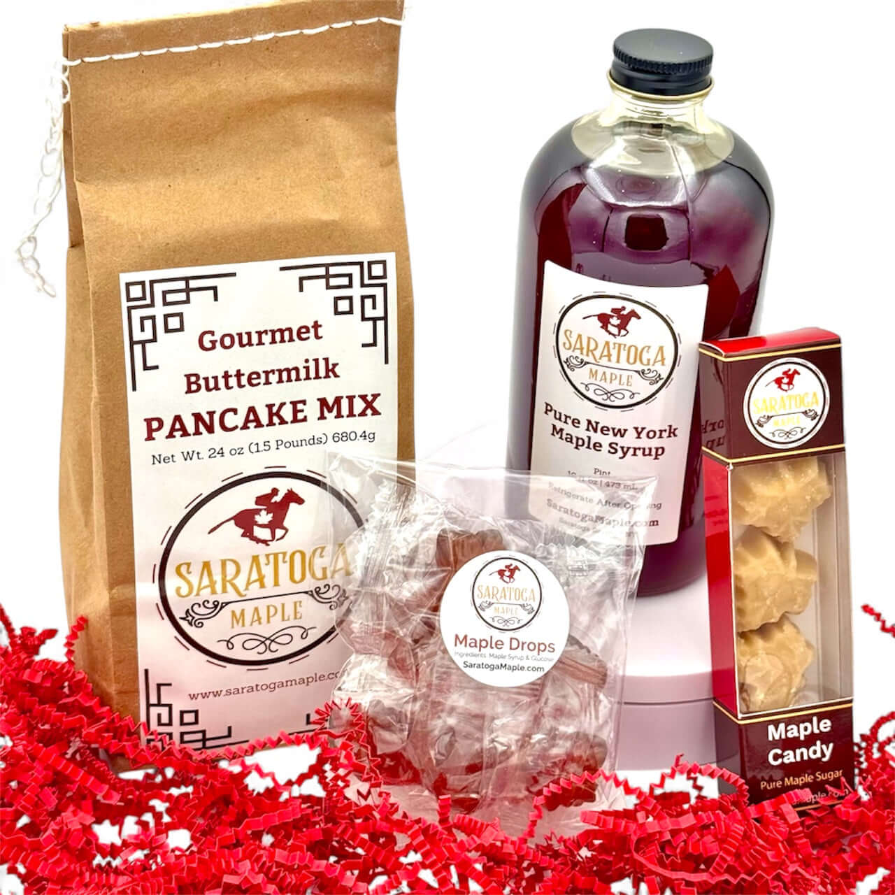 Your gift recipient will open to find a pint of our NY Maple Syrup in a Boston round glass bottle with old world charm. It is paired with a bag of our gourmet buttermilk pancake mix that's as easy to make as it is delicious. They also will love the two varieties of maple candy including drops of maple hard candy and a box of soft maple leaf candy.